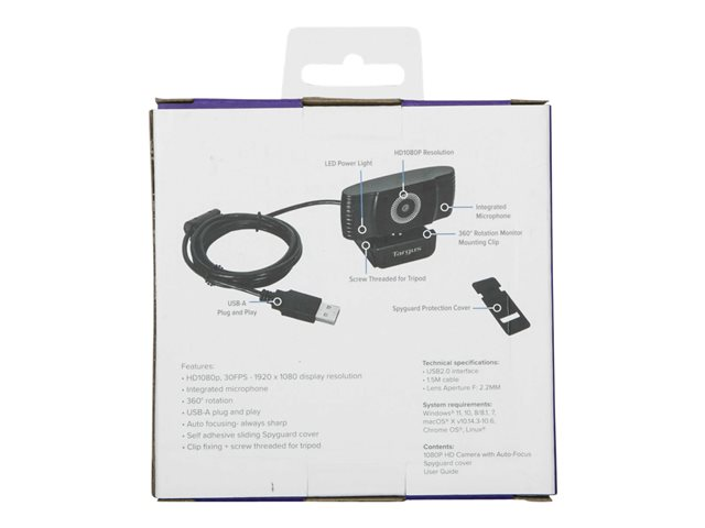 Targus Webcam Plus - Webbkamera - färg - 2 MP - 1920 x 1080 - 1080p - ljud - USB 2.0 - MJPEG, H.264, H.265