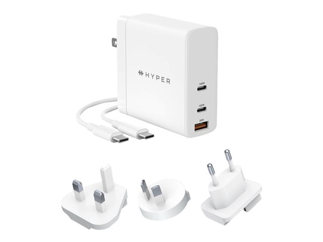 HyperJuice - Strömadapter - GaN-teknik - 140 Watt - Strömmatning 3.1, QC 3.0 - 3 utdatakontakter (USB, 2 x USB-C) - vit